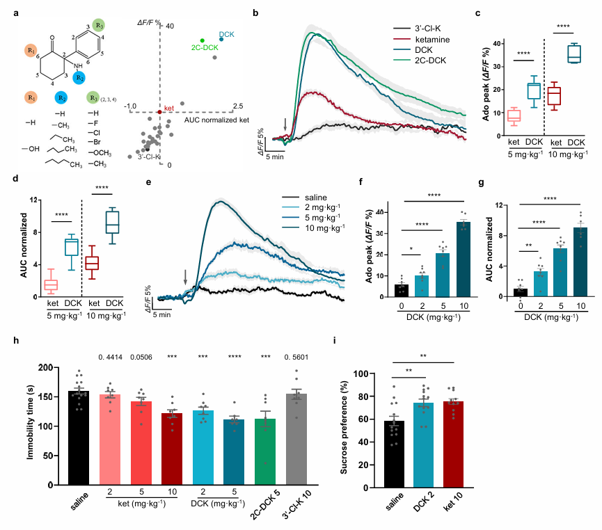 Fig. 2. Screening of ketamine analogs based on adenosine signaling and validation of their antidepressant effects. (a), Schematic diagram of ketamine analog design and in vivo adenosine release screening. Left: Compound structure modification strategy; Right: Scatter plot of peak adenosine release and area under the curve (AUC) induced by various compounds after in vivo administration (10 mg·kg⁻¹), data normalized to ketamine response. (b), Time course of extracellular adenosine dynamics in the medial prefrontal cortex after injection of DCK, 2C-DCK, 3′-Cl-ketamine, and ketamine (10 mg·kg⁻¹). Black arrows indicate administration time points. (c, d), Comparison of peak adenosine release (c) and AUC (d, normalized to saline group) induced by DCK and ketamine at equivalent doses. (e–g), Dose-effect analysis of DCK: Time course (e), peak (f), and AUC (g) of adenosine release after injection of different doses of DCK (2, 5, 10 mg·kg⁻¹) or saline. (h, i), Rapid antidepressant-like behavioral effects of preferred compounds in the chronic restraint stress model: immobility time in the forced swim test (h) and preference percentage in the sucrose preference test (i), measured 1 hour after intraperitoneal injection. Tested doses for ketamine and DCK are indicated; 2C-DCK used 5 mg·kg⁻¹, 3′-Cl-ketamine used 10 mg·kg⁻¹.Image by Wang Xiaohui